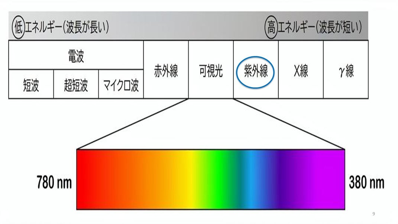 右の図のように、人に見える波長(可視光)は、赤~紫までです。それより外側の波長は見えず、人には色がわかりません。そのため「紫外線」と呼んでいます。英語ではUltraViolet Ray (略してUV)と呼んでいます。日焼けで存在に気が付きますが。