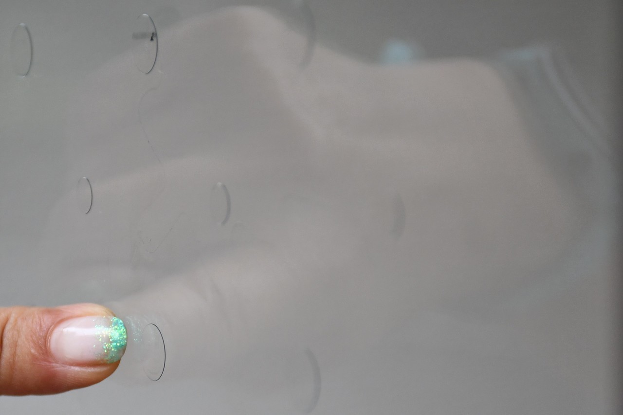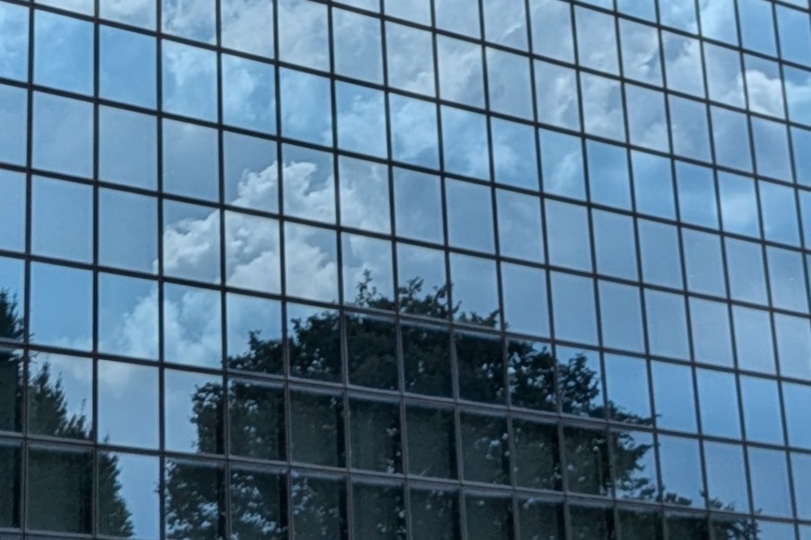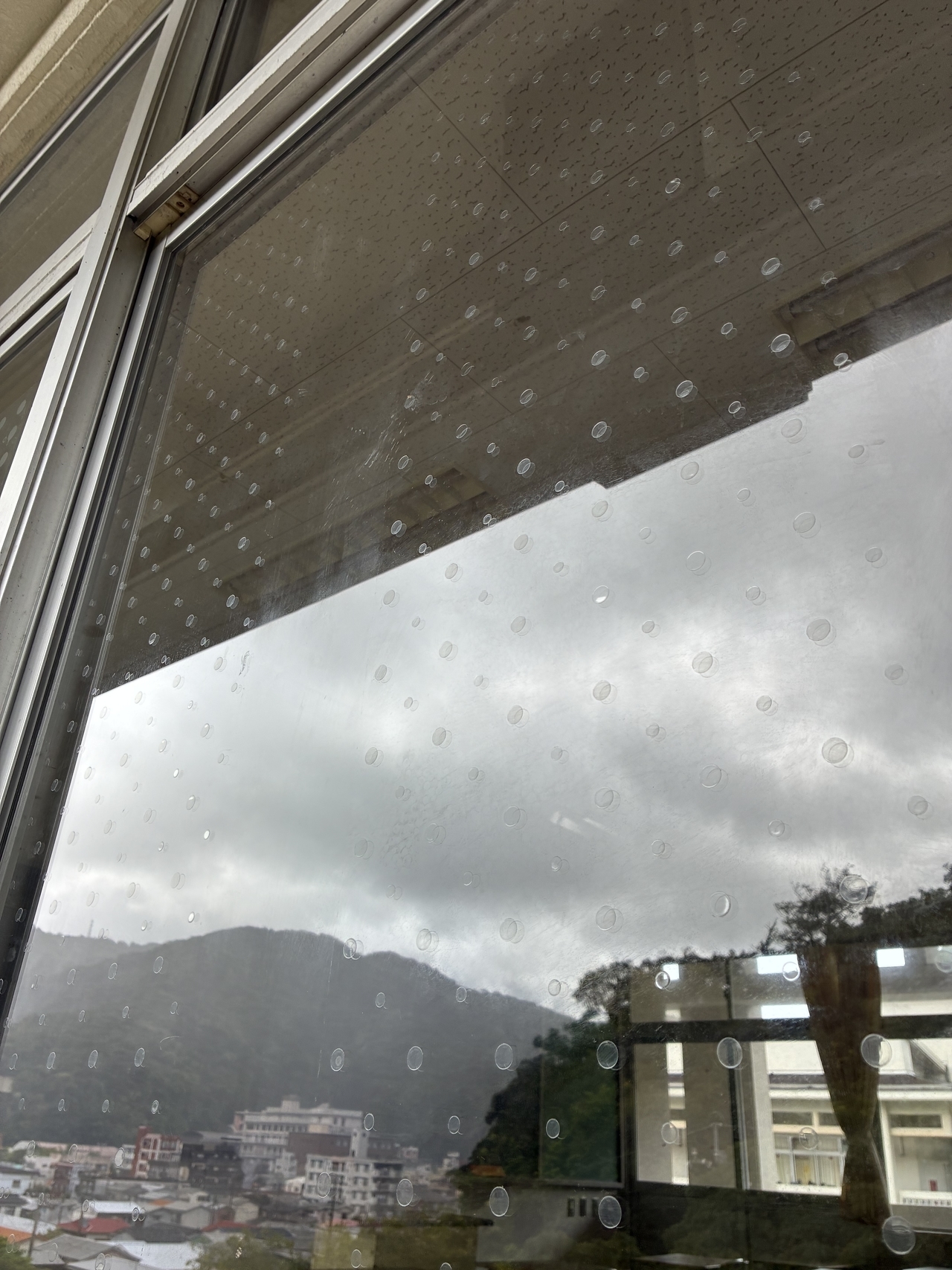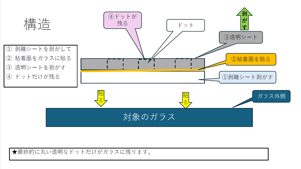近づいて見ると透明のドットがわかる(ガラスの外側に貼り付けている)