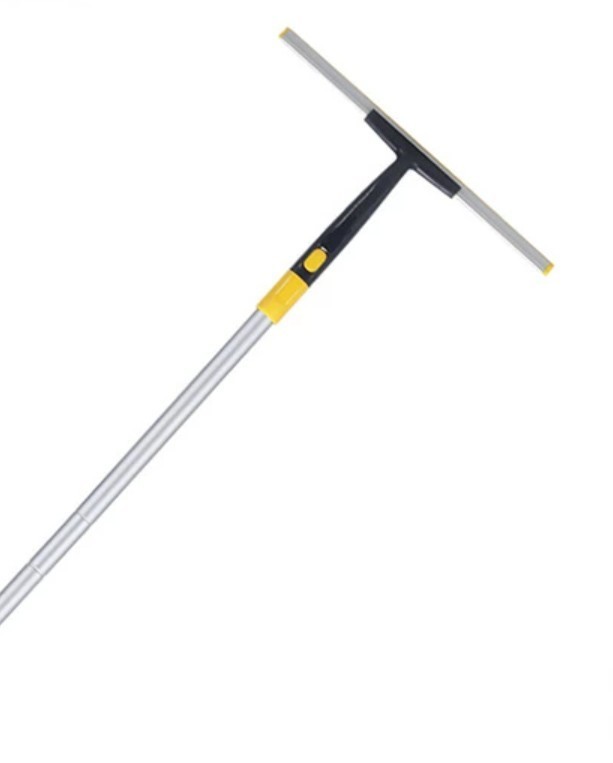 T字の水切りワイパーが便利。ヘッドにスポンジが付くものはガラス清掃でき、つなぐと長くなるものもあり、ネット通販でも販売されています。